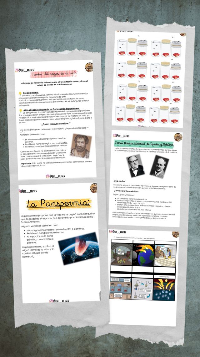 ✔ Comparación entre distintas teorías (creacionismo, generación espontánea, biogénesis, panspermia, teoría quimiosintética)